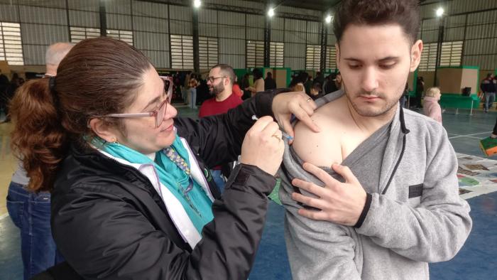 A Prefeitura de Estância Velha, por meio da Secretaria da Saúde (SMS), com a equipe da Vigilância em Saúde (VISA), participou no último sábado, dia 28 de junho, da VII Feira de Iniciação Científica Selvino Ritter. Foram realizadas várias ações de saúde preventiva, como testes rápidos (HIV, Sífilis, Hepatite A e B), prevenção da dengue, vacinas de rotina e gripe, e vacina para cães e gatos. O secretário da Saúde Yuri Campos esteve presente. “Vim agradecer aos profissionais da saúde que não medem esforços para realizar ações em prol da nossa comunidade”, disse Yuri. Conforme a coordenadora da Vigilância em Saúde, Eliane Fleck foram vacinadas 19 pessoas, e aplicadas 21 doses de vacinas para gripe, tétano e meningite.