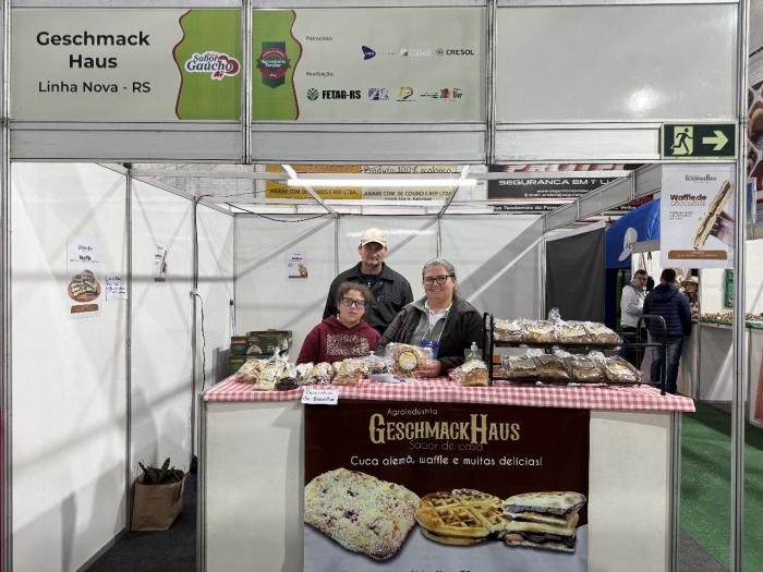 Uma das agroindústrias participantes foi a Geschmack Hause Sabor de Casa, comandada por Janete Lippert, com sede em Linha Nova, especializada em panificados como cucas, pães, waffles, biscoitos e rosquinhas. Entre os produtos, o destaque de vendas foi o waffle recheado, disponível nos sabores tradicional, chocolate meio amargo e salgado com salame e orégano. Janete avalia como muito positiva sua participação na Feira Sabor Gaúcho, destacando a fidelização dos clientes, e comemora o sucesso de vendas na Ruralfest. “O público se superou demais”, cita.