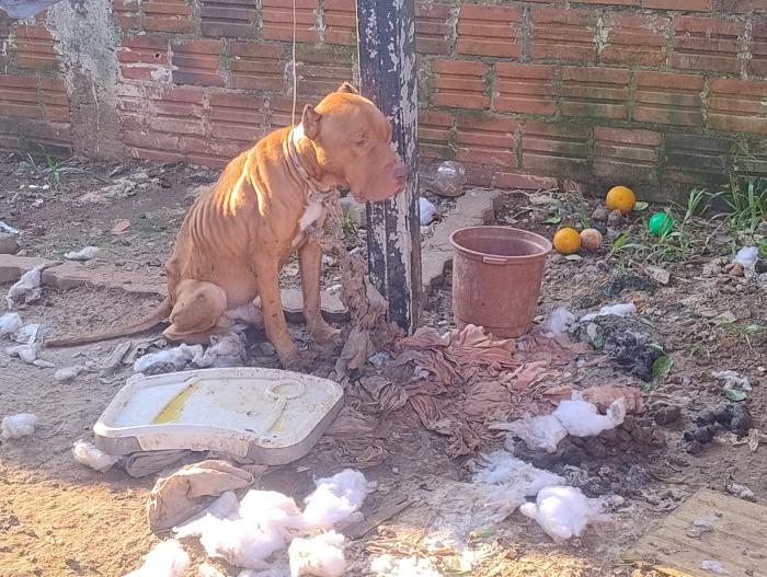Na residência, dois cães estavam em ambiente totalmente insalubre, em meio a fezes, sem abrigo e presos a correntes extremamente curtas. Um dos cães inclusive apresentava magreza extrema, com ossos do quadril e coluna visíveis. Questionado, o tutor não soube responder o motivo dos cães estarem nesse estado.